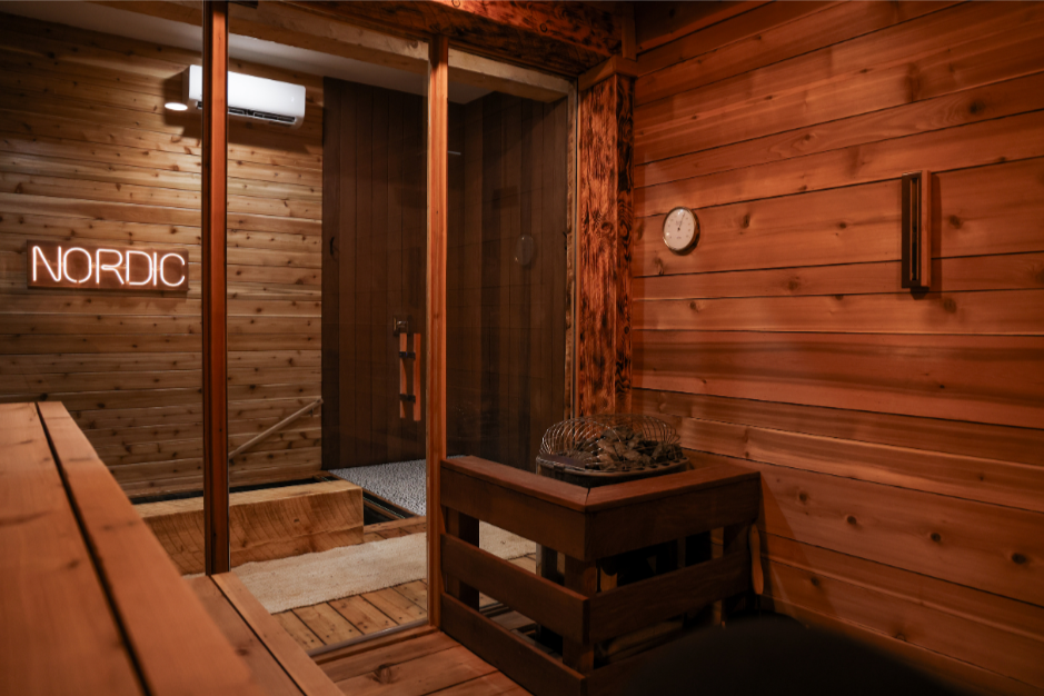 The ice bath is located just outside of the sauna doors. This larger shared sauna is able to hold 8-10 people comfortably at a time.